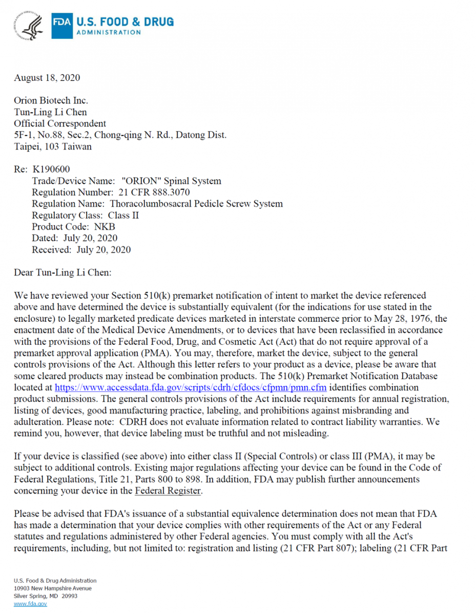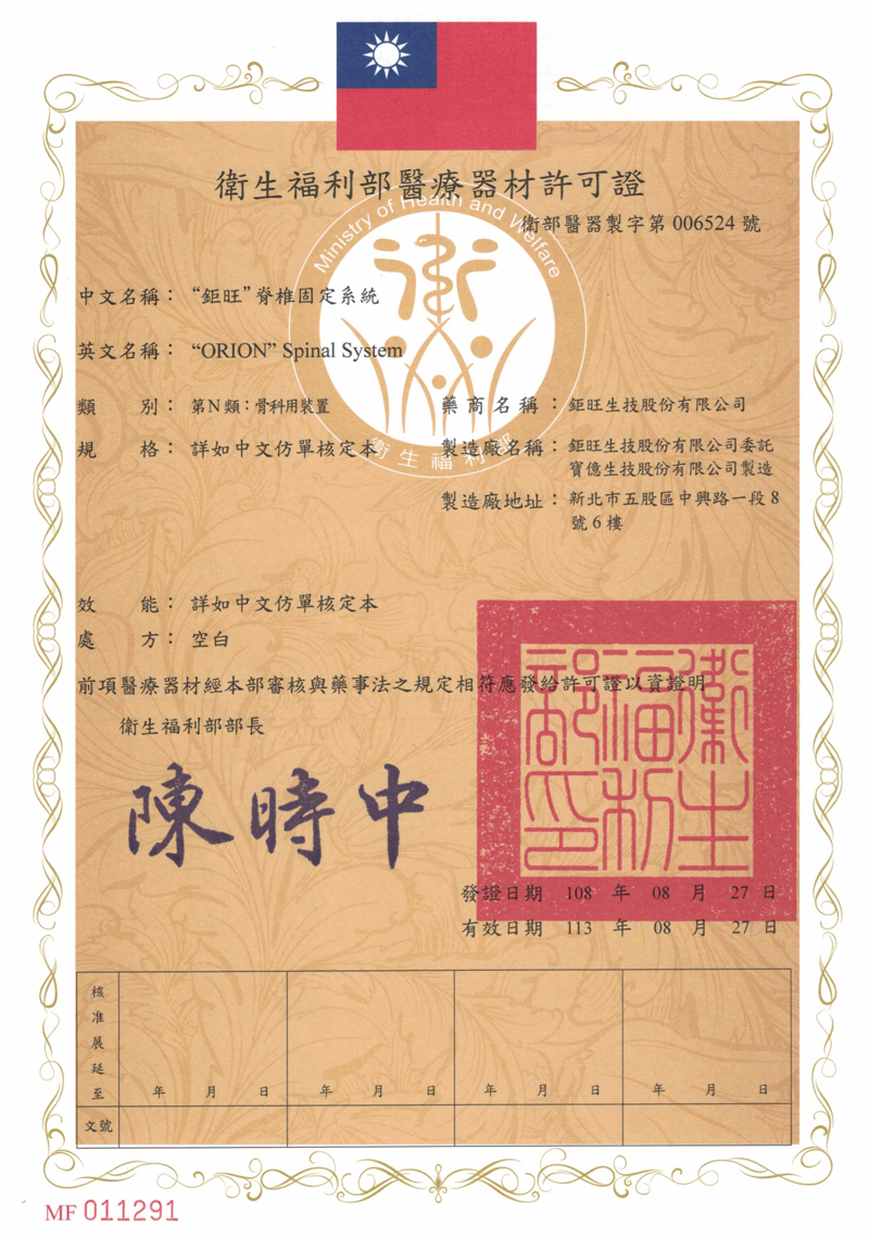鉅旺脊椎椎板護板已獲得美國FDA 510K及台灣醫材許可證